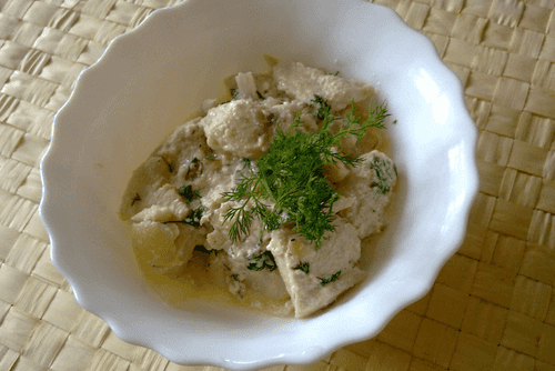Add onion to the chicken, simmer for another 5 minutes, and add chopped dill.
