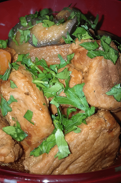 Pork stew with vegetables and mushrooms is a dish born from the traditions of French cuisine, where braising gives ingredients a rich flavor and tender texture. The pork is sautéed until golden brown, absorbing the aroma of garlic and onion, then combined with eggplants, sweet peppers, and mushrooms. Tomato juice adds a slight acidity and rich taste, while spices and parsley finish the composition with fresh notes. The dish is aromatic, with tender meat and juicy vegetables, perfect for a cozy family dinner. Thanks to the long braising process, the flavors blend into a harmonious combination, making the stew warming and hearty. It pairs wonderfully with crispy baguette or creamy mashed potatoes, highlighting its French sophistication.