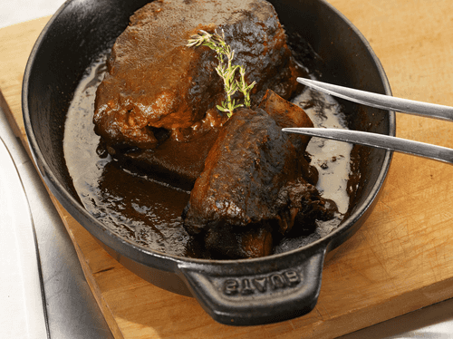 Season the ribs (preferably marble beef) with salt and pepper, and sear well in olive oil with whole garlic cloves, thyme, and rosemary.