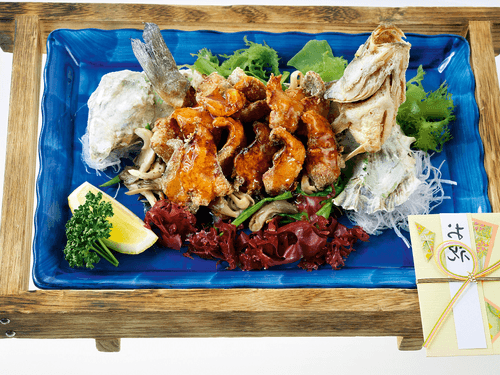 Coat the fish skeleton in starch, bend it into a crescent shape, secure it with a wooden skewer, and deep-fry. Pat dry with a paper towel and place on a plate, adding thinly sliced daikon for stability.
