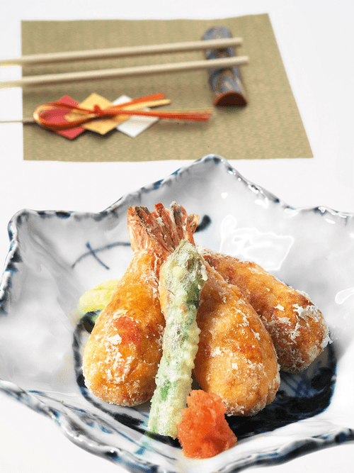 Ebi-satoimo-shinjo is a refined dish of Japanese cuisine that reflects the harmony of textures and flavors. These exquisite patties made from shrimp and satoimo, tender Japanese taro, are infused with the aroma of garlic and ginger. A hint of pine nut adds a light nutty note, while butter provides creaminess. Fried in airy tempura batter, they achieve a crispy crust that contrasts with the delicate filling. Served with a spicy sauce based on soy sauce and mirin enriched with umami from bonito flakes. Daikon mixed with tomato sauce adds a refreshing tang, while crispy asparagus complements the dish's freshness. Ebi-satoimo-shinjo is not just a treat but an art of flavors born in Japanese culinary traditions where each ingredient plays its unique role in creating true gastronomic pleasure.