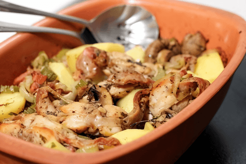 In the pan where the bacon was fried, melt butter and sauté onion, garlic, and celery. Add thyme and parsley, place everything in the dish with rabbit, add mushrooms and potatoes. Mix well.