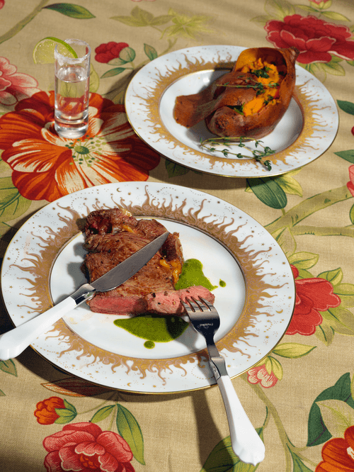 Ribeye with sweet potato and chimichurri sauce is a dish that embodies the passion of Latin American cuisine for rich flavors and aromas. Tender, juicy ribeye steak seared to a perfect crust and finished in the oven pairs with creamy sweet potato puree flavored with lime, basil, and cumin. The composition is complemented by a vibrant chimichurri sauce where fresh cilantro, parsley, and oregano harmoniously blend with garlic, spicy chili pepper, and wine vinegar to create a zesty herbal accent. This dish is perfect for a cozy dinner, highlighting the richness of South American culinary traditions. Its rich flavor, tender meat texture, and fresh note of the sauce make ribeye with sweet potato and chimichurri a true celebration of taste.