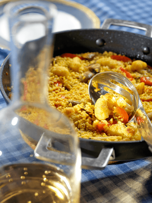 Vegetable paella is a vibrant dish from Spanish cuisine that combines the rich flavors and aromas of fresh vegetables, saffron, and classic 'Bomba' rice. Historically, paella originated in Valencia as a peasant dish made from locally available ingredients. In this version, meat is replaced with vegetables, making the dish light and rich in natural flavors. Sweet peppers add freshness, mushrooms provide depth, and saffron gives a refined golden hue and subtle Eastern aroma. It’s the perfect treat for those who appreciate healthy eating rich in vitamins. Vegetable paella pairs wonderfully with a glass of white wine or fresh herbs. Served hot straight from the pan, it allows you to enjoy its rich texture and sunny Spanish mood.