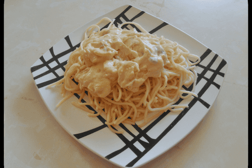 Spaghetti in creamy sauce with shrimps