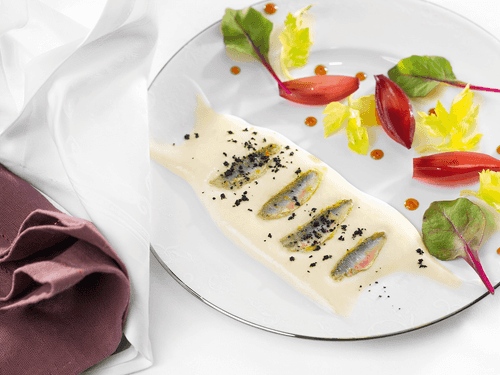Place an airy foam of mashed potatoes on the plate, lay the red mullet on top, and sprinkle with olive soil. Decorate the rest of the plate with celery leaves, young beets, and drops of teriyaki.