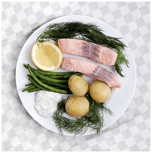 Boiled salmon with vegetables Swedish-style is a simple yet exquisite dish embodying the traditions of Scandinavian cuisine. In Sweden, fish holds a central place in gastronomy due to the abundance of water bodies and a love for fresh, natural ingredients. Atlantic salmon, gently boiled in water, retains its tenderness and rich flavor, while the addition of young potatoes and fresh green peas adds lightness and balance to the dish. The key detail is the creamy horseradish and dill that create a spicy yet refreshing sauce highlighting the fish's natural sweetness. Serving with a slice of lemon enhances the aroma, turning the meal into a true gastronomic delight. This recipe is an ideal choice for a light yet nutritious dinner that brings the taste of Northern Europe to every fork.