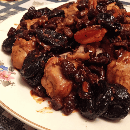 Oriental-style chicken drumsticks with dried fruits and couscous