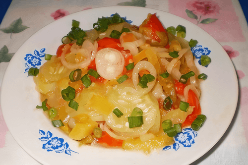 Vegetable stew with cucumber is a light yet flavor-rich dish of European cuisine. It combines the freshness of cucumbers, the gentle tartness of tomatoes, and the sweet notes of bell peppers. Onion adds a piquant touch, while vegetable oil makes the texture soft and velvety. This stew is perfect for a summer lunch or dinner as it doesn't overload the body and provides a feeling of lightness. Historically, such dishes were prepared in rural areas using seasonal vegetables to preserve their natural taste. The stew can be served as a standalone dish or as a side to meat or fish. Its simplicity in preparation makes it an excellent choice for those who value healthy eating and vibrant flavor combinations.