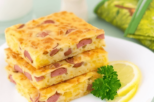 Cheese and sausage pie is a cozy and hearty dish of European cuisine that evokes home comfort and warm family evenings. Its history is linked to simple rural baking, where the combination of dough, cheese, and meat products became a classic choice for a quick and tasty dinner. The pie's flavor is rich, with a tender dough texture, salty aroma of cheese, and a spicy note from the sausages. It can be served hot or cold, and due to its ease of preparation, it is perfect for both everyday menus and cozy gatherings. The pie can be paired with a light salad or sour cream-based sauces, making it even more versatile and appetizing.