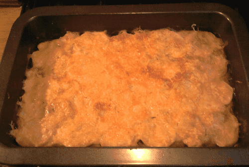 Potato gratin with chicken, mushrooms and cheese