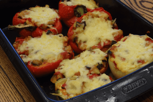 Stuff the halves of the pepper with vegetable mixture and top with grated suluguni cheese.