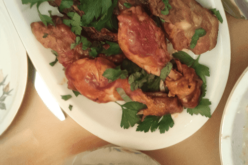 Fry the ribs until golden brown and place them on a plate. Pour the marinade into the pan and let it 'bubble' (do not keep on heat for more than a minute). Serve the sauce separately. Garnish the meat with parsley.