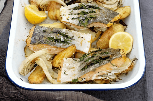 Salmon baked with potatoes and fennel
