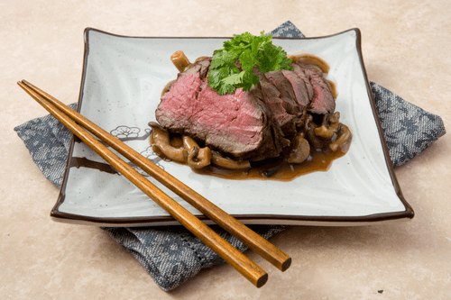 Beef with oyster mushrooms in hot and sour Chinatown sauce