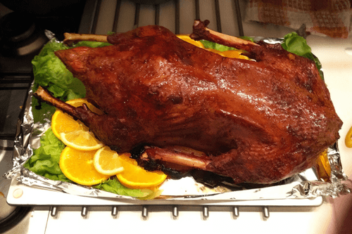 Goose stuffed with apples and oranges