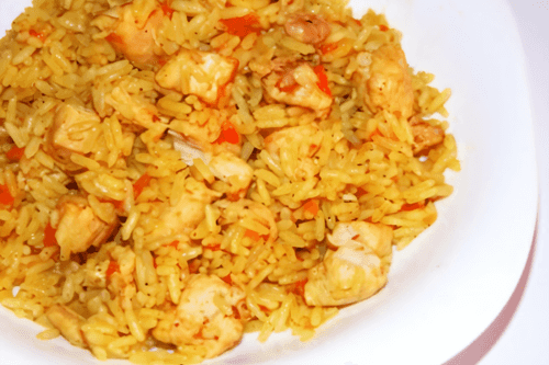 It is advisable to prepare all ingredients in advance. Cut the chicken meat into cubes. Chop the onion. Cut the carrot into strips. Peel the garlic. Rinse the rice.