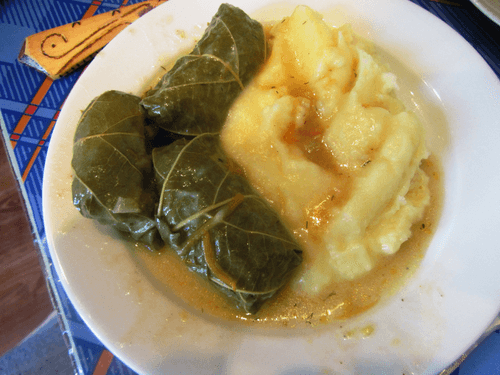 Prepare the sauce. Crush garlic with a garlic press and chop the herbs. Add garlic, herbs, salt, and pepper to the yogurt and mix. Serve hot dolma with the sauce.