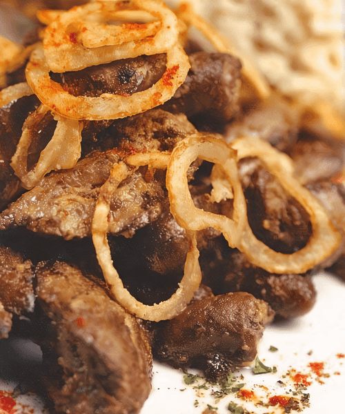 Fried chicken liver with onions and spices is a dish that combines rich spice aromas and the soft texture of liver. Its roots trace back to European cuisine, where the skill of cooking offal has reached true mastery. The liver, fried in sesame and vegetable oil, absorbs the spicy notes of cumin, coriander, and red pepper, creating a rich flavor spectrum. The light caramelization of onions adds sweet undertones that harmonize with soy sauce. The finishing touch is fresh cilantro, adding zest and freshness. This dish is perfect for both everyday dinners and special occasions; it can be served with a side of rice or fresh vegetables. A true delight for gourmets who appreciate the balance of flavors and textures.