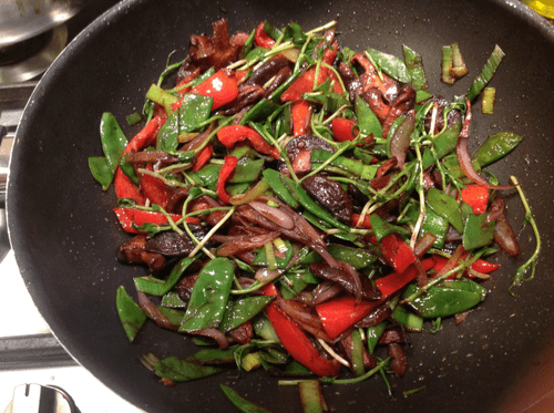 Remove from heat, add green onion, pea sprouts, and cooked udon.