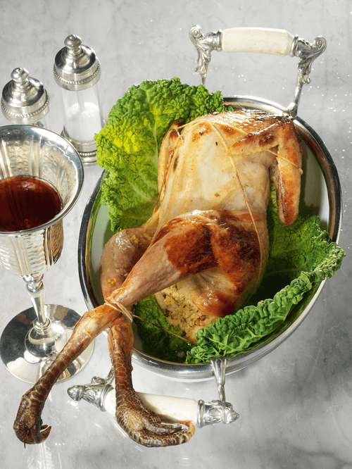 Boil a halved head of garlic, thyme, cinnamon, and star anise in salted water. Pour the brine over the guinea fowl and refrigerate for six hours.