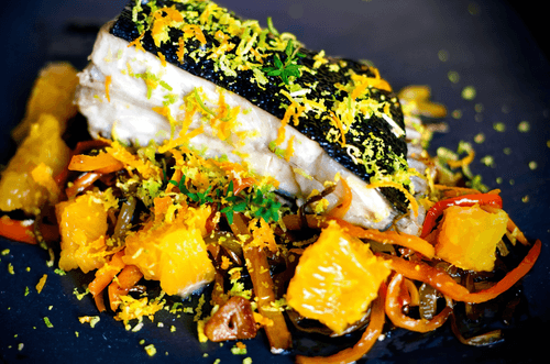 Place the vegetables on a warm plate, top with turbo, and arrange peeled pieces of sweet orange around it, sprinkling with lemon, lime, and orange zest.