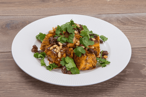 Salmon with saffron and pine nuts is an exquisite dish of European cuisine that delights with its sophistication and depth of flavor. Tender pieces of salmon infused with the aroma of saffron and the sweetness of port wine harmonize with soft notes of raisins and crunchy pine nuts. Saffron, known as the 'gold of spices,' adds warmth and a hint of spice, turning the dish into a true gastronomic symphony. The sauce reduced with port wine gives the fish a noble richness. It’s the perfect choice for a dinner with loved ones when you want to treat yourself to something special. The garnish with cilantro completes the flavor composition, adding freshness and a light herbal note.