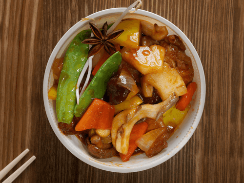 Then add chopped vegetables to the pork, increase the heat, fry everything for three minutes, and then mix in the sauce. Lower the heat, let the finished dish sit for four minutes to blend the flavors. Serve in deep bowls.