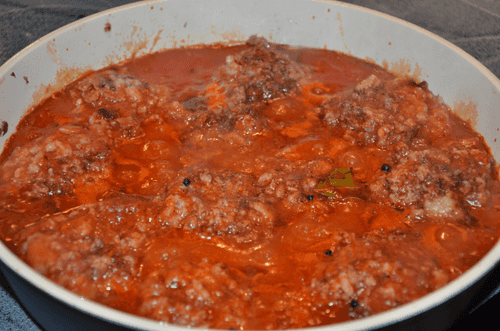 Dilute 0.5 liters of water with 2 tablespoons of tomato paste and 3 tablespoons of flour, pour over the meatballs. Add spices, sugar, and salt.