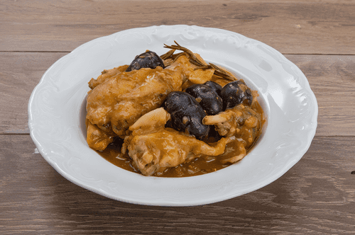 Rabbit with olives is a refined dish of European cuisine that combines tender meat with the piquant taste of olives and the aroma of rosemary. This recipe originates from Mediterranean traditions where rabbit is cooked with white wine and fresh herbs. The browned pieces of rabbit are infused with a rich tomato-wine sauce, while garlic and olives add expressive flavor notes. The dish has a rich, harmonious taste—the softness of the rabbit is perfectly complemented by the salty hint of olives. Served hot and garnished with fresh parsley, it pairs ideally with a glass of dry white wine. Rabbit with olives is a choice for a cozy dinner or an exquisite festive table.