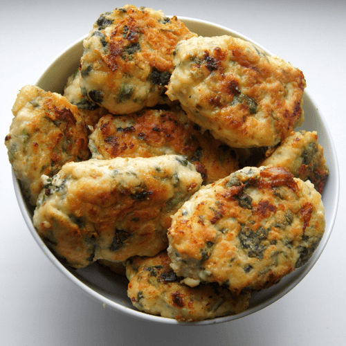 Form small patties with wet hands. Quickly dip in lightly beaten egg, then coat in flour or breadcrumbs. Immediately place in a heated pan with olive oil.