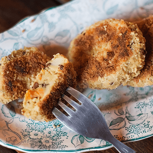We shape small, neat patties and coat them in breadcrumbs. Fry in oil over medium heat until golden brown.