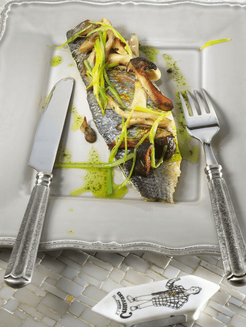 Sea bass with mushrooms and leeks