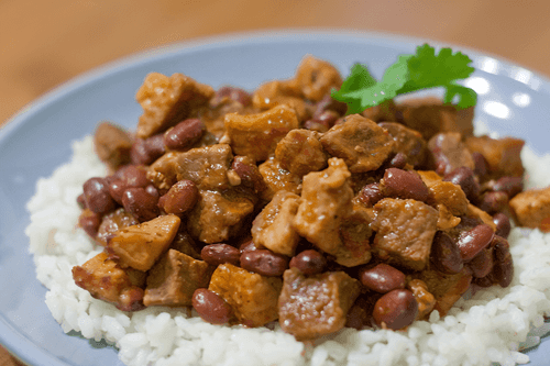 Pour in the chili puree and broth, reduce the heat to medium and cook covered, stirring occasionally, for about an hour until the meat is tender. Drain the canned beans in a colander to let the juice drain. Add them to the saucepan, mix and cook for another four to five minutes. Season with salt and pepper.