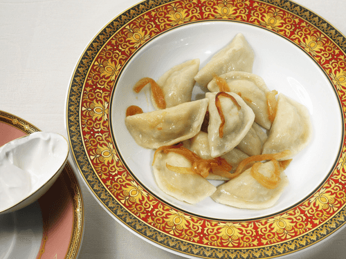Make dumplings: put two teaspoons of filling in each. Or more for larger dumplings. Boil in boiling water: each portion will cook for seven to eight minutes. Serve garnished with caramelized onions.