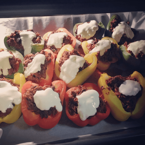 Fill halved peppers (without seeds) with filling and place them on a baking tray lined with parchment paper.