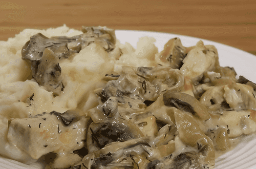 Chicken with mushroom sauce is a classic dish of European cuisine that captivates with its delicate taste and the aroma of forest mushrooms. The origins of this recipe trace back to ancient European traditions where the combination of juicy meat and rich mushroom sauce symbolized home comfort and exquisite dining. Golden-browned chicken breast soaked in creamy sauce with fresh mushrooms, onions, and dill reveals a rich flavor bouquet. The sour cream-based sauce adds softness and harmony to the dish, perfectly complementing the meat. The dish pairs wonderfully with mashed potatoes or pasta, creating a hearty and elegant lunch or dinner. Its versatility allows it to be served both at everyday meals and festive tables, delighting guests with warmth and rich flavor.
