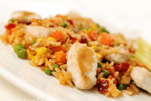 Mix the ready pilaf with chicken and vegetables and let it sit covered for another 5 minutes.