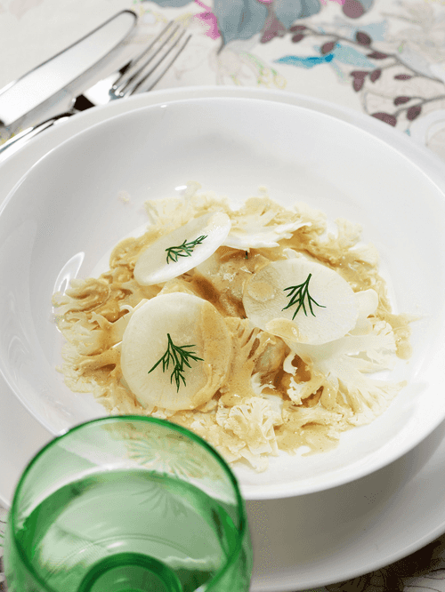 Slice the radish and cauliflower thinly using a mandoline or knife. Place the fish on a plate, top with cabbage and radish, drizzle with sauce, and garnish with dill.