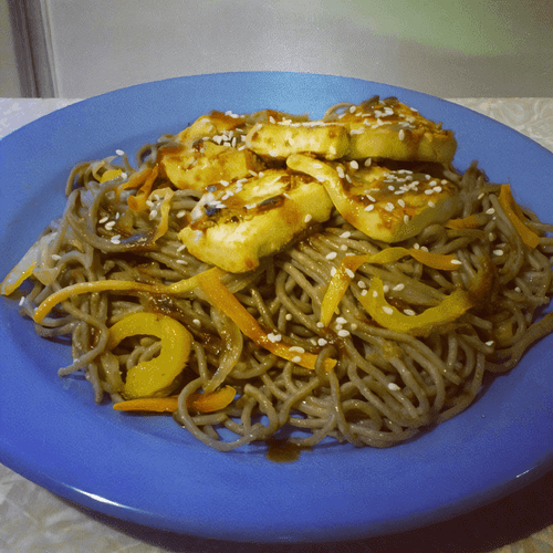 Soba noodles with vegetables and tofu cheese under teriyaki sauce
