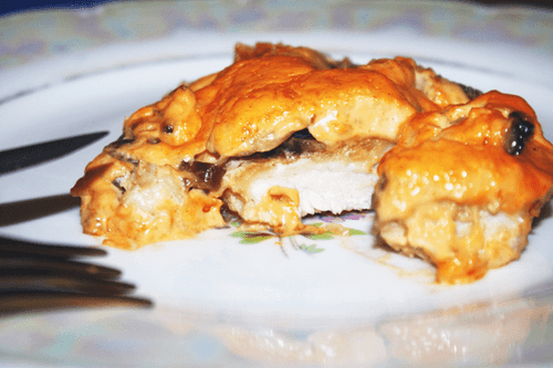 Tender pork with mushrooms in cheese sauce