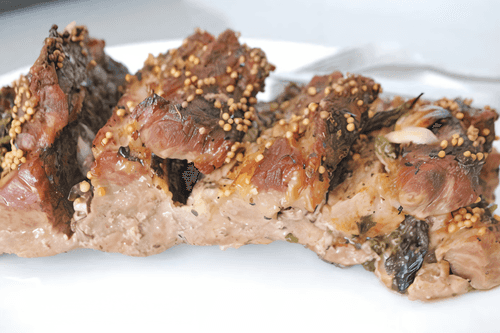 Carefully place the meat in the sleeve. Spread it out to cook evenly. Send it to a preheated oven at 200 degrees for 50-60 minutes (depending on weight). In the end, I do NOT cut the sleeve, as the crust forms anyway.