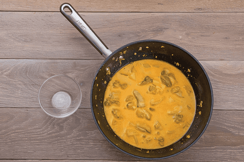 Add coriander, curry, garlic, ginger, and chili pepper, fry for another 30 seconds, add sugar, tikka masala, coconut milk, bring to a boil, and simmer for 2 minutes.