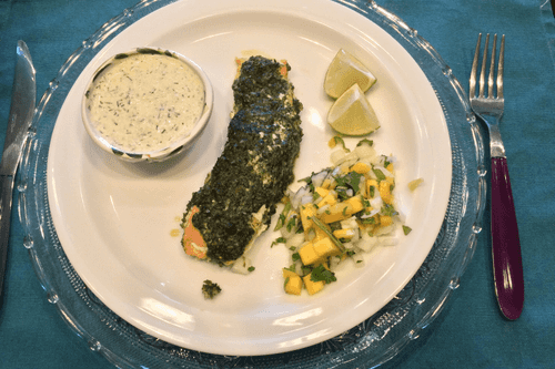 Since the pesto will likely spill, carefully remove the fish from the sauce using kitchen tongs and place it on a plate.