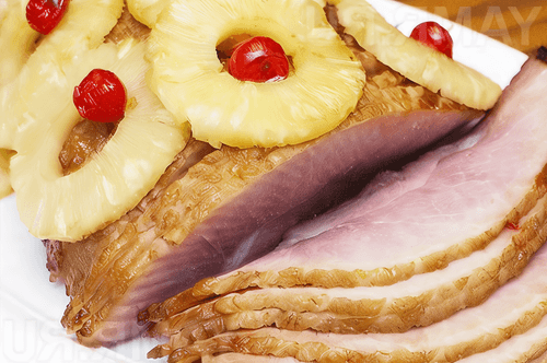 Place pineapple and cherry on top of the meat.
