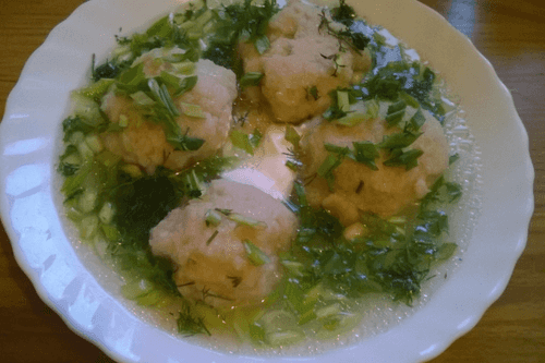 The ready dumplings are served with chicken broth and a spoon of sour cream, and herbs are added to taste. Instead of herbs, finely chopped fried garlic can be added.