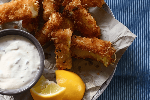 Fish sticks with tartar sauce are a refined dish of European cuisine, combining a crispy texture and delicate fish flavor. This recipe is rooted in the traditions of preparing breaded seafood popular in many countries. White fish coated with aromatic cheese breadcrumbs acquires a golden crust after baking while remaining soft and juicy inside. The combination with refreshing tartar sauce—a classic of French cuisine—adds zest to the dish and balances its taste. Perfect for both a cozy home lunch and festive gatherings. Serving with lemon slices highlights the light citrus notes, adding freshness to the dish. The simplicity of preparation makes this recipe versatile and accessible even for novice cooks.