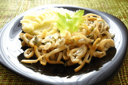 Make mashed potatoes from boiled potatoes as usual. On a plate, place the mashed potatoes, squid, 3 lemon wedges (which can be used to drizzle over the squid), and a bit of greenery.