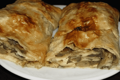 Mushroom roll in lavash is a fragrant and tender dish of Russian cuisine that perfectly combines the juiciness of mushrooms, the softness of cheese, and the freshness of greens. Lavash, borrowed from Armenian culinary tradition, serves as an elegant wrap that transforms simple ingredients into a refined roll. Mushrooms, lightly fried or used in canned form, give the dish a rich forest flavor, while cheese melts inside, creating an appetizing stretchiness. Baked to a golden crust, the roll acquires a slight crunchiness, and fresh greens add a touch of freshness. This versatile dish is suitable for both cozy home dinners and festive gatherings. It pairs especially well with mushroom soup or a cup of fragrant tea.