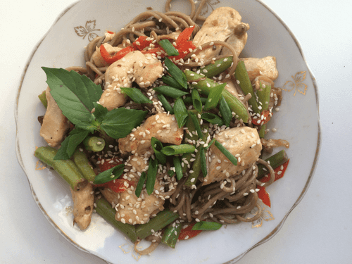 Add noodles to the pan, it's important(!) that there is no water in it. Also add an egg. Stir-fry to let the vegetable flavors absorb into the pasta. After 2 minutes, add the second part of the sauce to the dish. Fry for 2-3 minutes. Serve with greens.